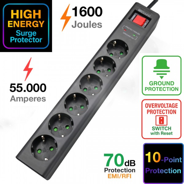 Eliminate electromagnetic interference. The sensitive circuitry of your electronic equipment needs to be protected against electromagnetic noise and electric current “impurities”. All our surge protectors come with an impressive 70dB integrated filter.