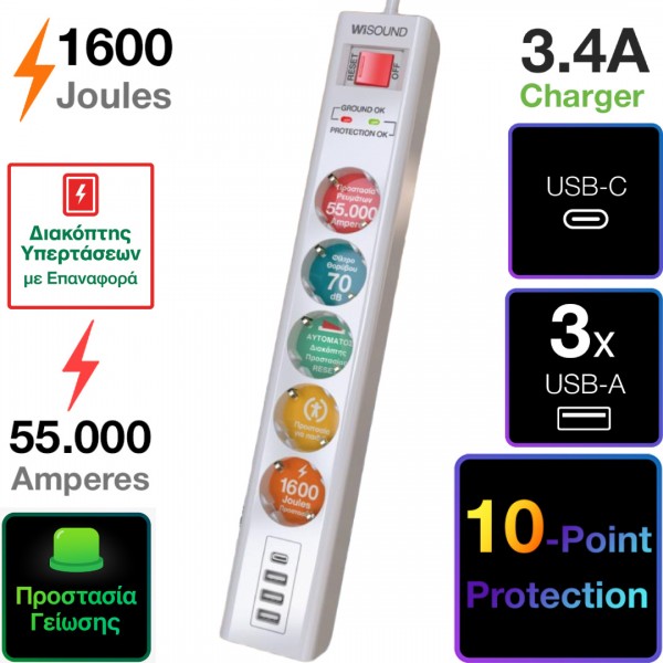 Surge Protector with 1600Joules, 5-sockets, 3 USB-A, 1 USB-C port, and Reset Switch